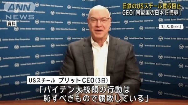 アメリカのバイデン大統領が日本製鉄によるUSスチールの買収阻止を正式発表したことについて、USスチールのトップは「同盟国の日本を侮辱している」と厳しく批判しました。