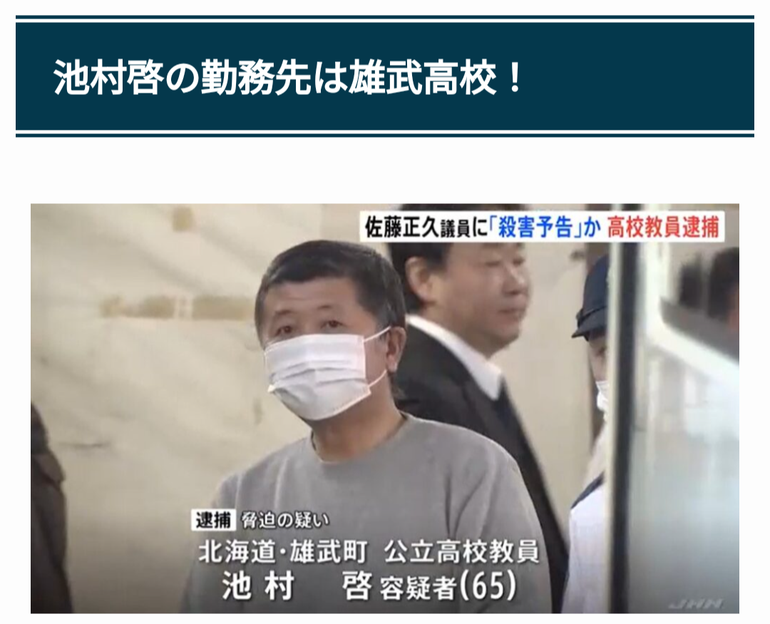 北海道の高校教師・池村啓被告(65)は2022年8月から2023年1月にかけて「安倍晋三の次はお前だ」「首を洗って待っていろ」などと書いた紙を自民党の高市早苗衆院議員、山谷えり子参院議員、杉田水脈元衆院議員宛てに郵送し脅迫した疑いが持たれています。
