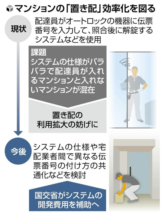 国土交通省は、荷物を玄関先に届ける「置き配」の活用を進めるため、オートロック付きマンションへの配達を効率化する支援に乗り出す。