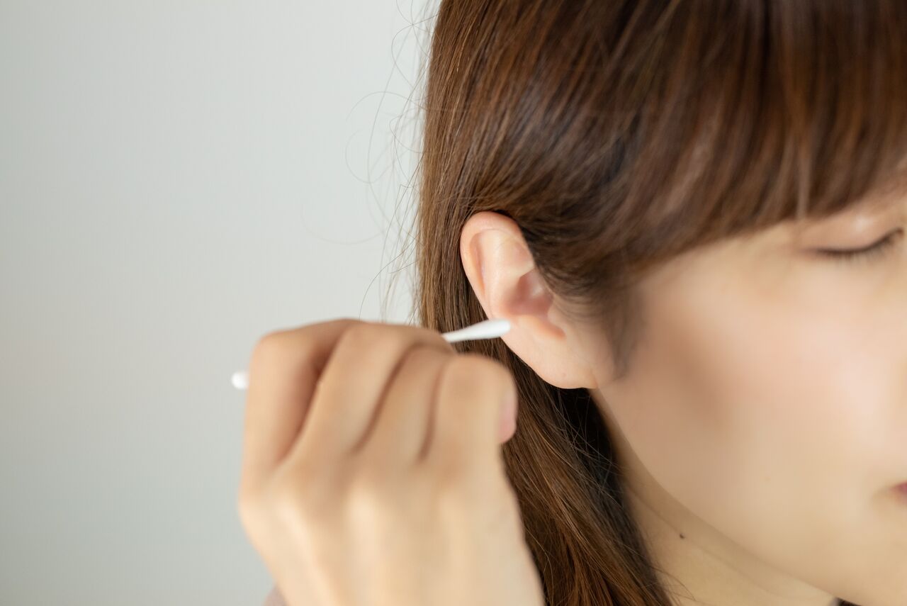 A 基本的には細い綿棒を使い、明るい場所で行いましょう。綿棒を利き手で鉛筆持ちし、小指の側面を耳に当てて支えにします。反対側の手で耳の外側を軽く引き、耳あかを拭います。硬い場合は、竹製などの耳かき棒で軽く引っかけて手前に転がすように取ります。