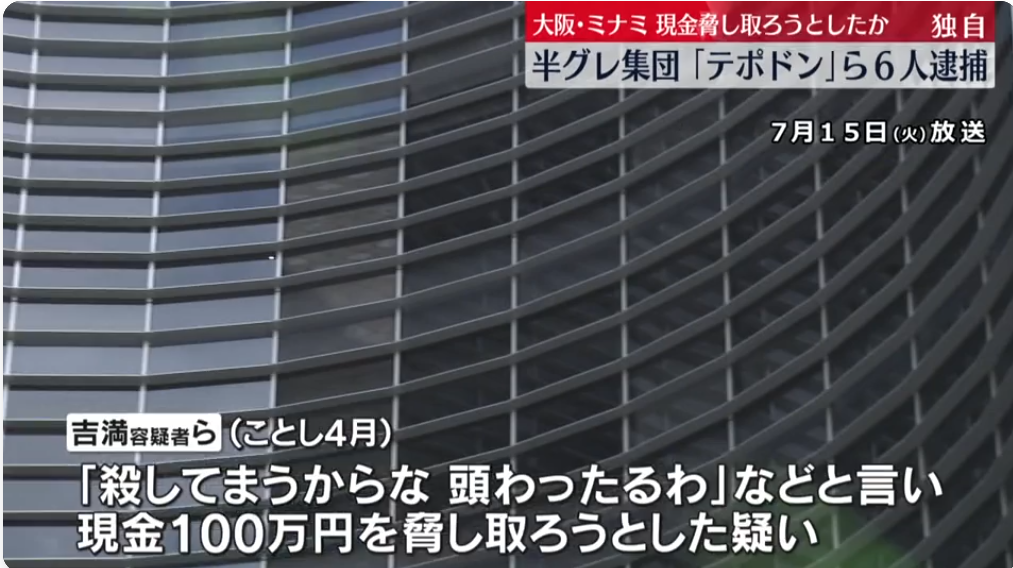 大阪の半グレ集団で『テポドン』と名乗る男らが、知人男性を殴って現金を脅し取ろうとしたとして逮捕されたことが15日、捜査関係者への取材でわかりました。