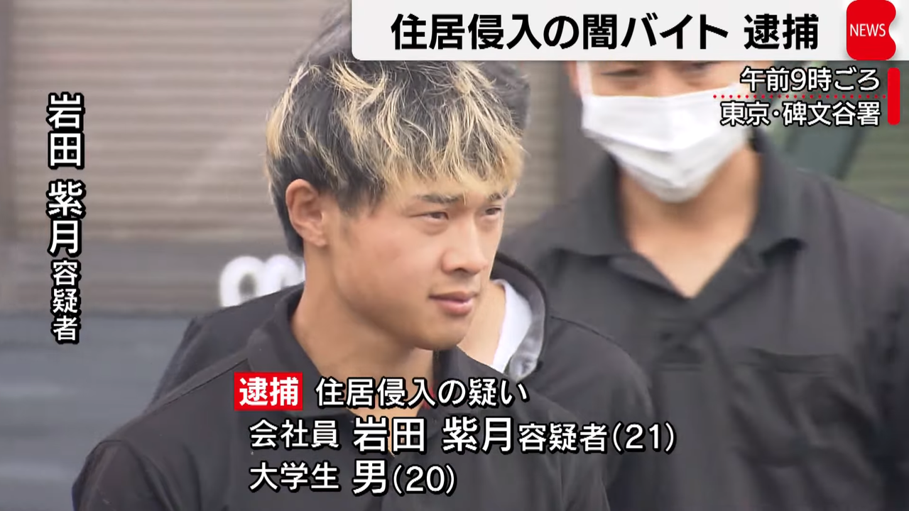 警視庁によると、両容疑者は知人同士で、岩田容疑者が闇バイトに実行役として応募し、大学生を誘って見張り役をさせたとみられる。